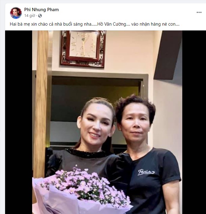 Mới đây nhất, vào ngày 27/3, Phi Nhung đã đăng tải một hình ảnh vô cùng thân thiết khi chụp ảnh với mẹ ruột của Hồ Văn Cường cùng với dòng trạng thái: “Hai bà mẹ xin chào cả nhà buổi sáng nha......Hồ Văn Cường.... vào nhận hàng nè con....”