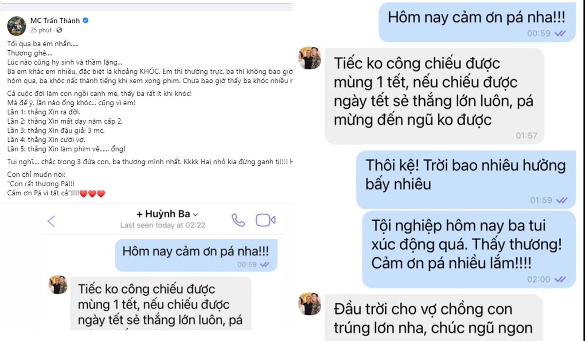 Sau buổi công chiếu phim, ba ruột của Trấn Thành cũng gửi đến anh những dòng tin nhắn chúc mừng cho thành công của con trai. Đoạn tin nhắn còn tiết lộ cách xưng hô đặc biệt khi Trấn Thành gọi bố ruột là “Pá’. Trước tình cảm của bố ruột với tác phẩm của mình, ông xã Hari Won vô cùng xúc động và gửi lời cảm ơn và yêu thương đến ba mình: "Con rất thương Pá!!! Cảm ơn Pá vì tất cả"!!.
