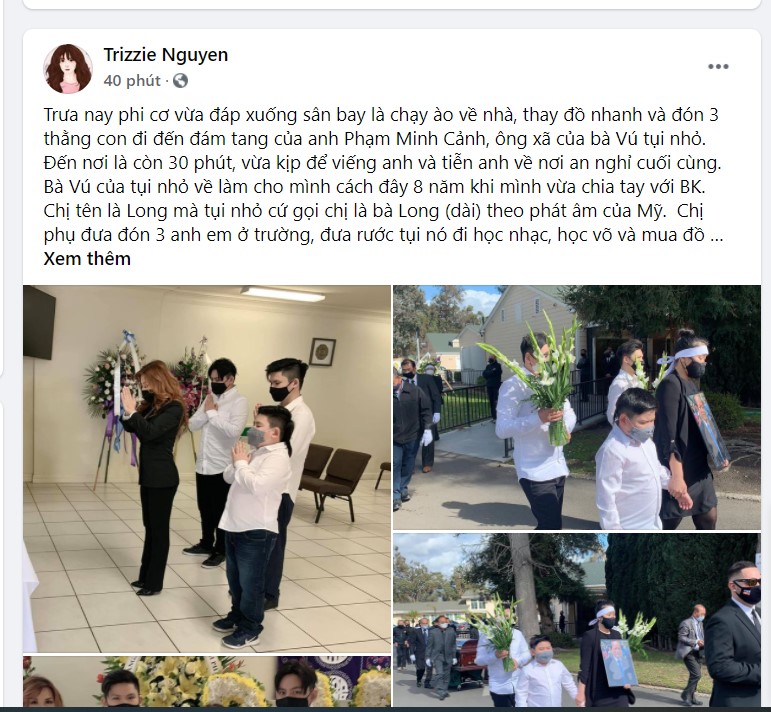 Theo đó nữ ca sĩ hải ngoại cho biết cô vừa đáp máy bay và vội vàng đón 3 con trai để kịp đến viếng và tiễn chồng của bà vú chăm sóc cho các con cô về nơi an nghỉ cuối cùng.