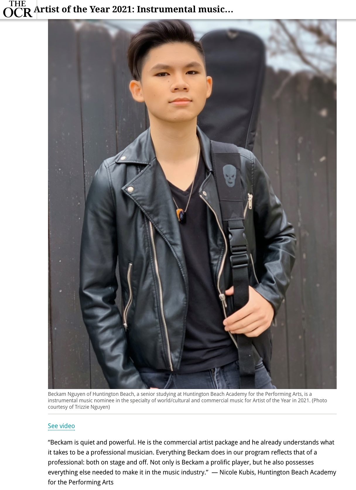 Hôm nay nhận được một email khá quan trọng, nó đã làm mình vui không thể nói thành lời, đọc mà nước mắt cứ rưng rưng. Email gửi từ tờ báo Mỹ OC Register thông báo là con trai lớn của mình, Beckham đã được chọn nằm trong danh sách hơn 100 học sinh trường nhạc được đề cử cho danh hiệu Nghệ Sĩ Của Năm 2021 (OC Artist of the year 2021) từ các bộ môn nhạc cụ như sax, guitar, bass, piano, violin, cello, drums v.v. Tất nhiên đây chỉ là bước sơ khởi nhưng được nằm trong danh sách đề cử Beckham cũng phải vượt qua bao nhiêu học sinh trong trường nhạc Huntington Beach Academy for the Performing Arts và các trường nhạc tại Quận Cam. Từ danh sách này ban giám khảo sẽ chọn ra một cho từng bộ môn và sẽ thông báo kết quả vào tháng 5. Không biết con mình có đủ khả năng để giành được giải Artist of the year 2021 hay không vì phải trải qua phần thi chung kết rất khắt khe nhưng Beckham đã làm mẹ vui và tự hào không ít khi đi đến được mức này. Hôm nay con được đề cử Artist of the year của Orange County nhưng tương lai sẽ là Artist of the year của The Grammy Award con nhé. Ước mơ không tốn tiền mua nên mẹ con mình cứ mơ ước con nhỉ? Mẹ luôn ủng hộ con và sẽ cùng con đi trên con đường mà con đã chọn lựa. Yêu con nhiều”.