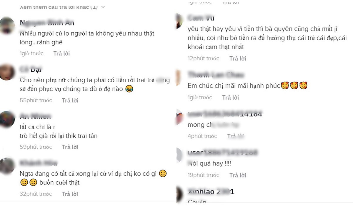Ở phần bình luận, vẫn có một số ý kiến tiêu cực khi nhận xét về mối quan hệ của Lệ Quyên và tình trẻ. Tuy nhiên, không ít khán giả ủng hộ sự dũng cảm trong tình yêu của Lệ Quyên và cho rằng nữ ca sĩ đã là người có dày dặn kinh nghiệm nên cô sẽ có cảm nhận chính xác về người mình đang yêu.
