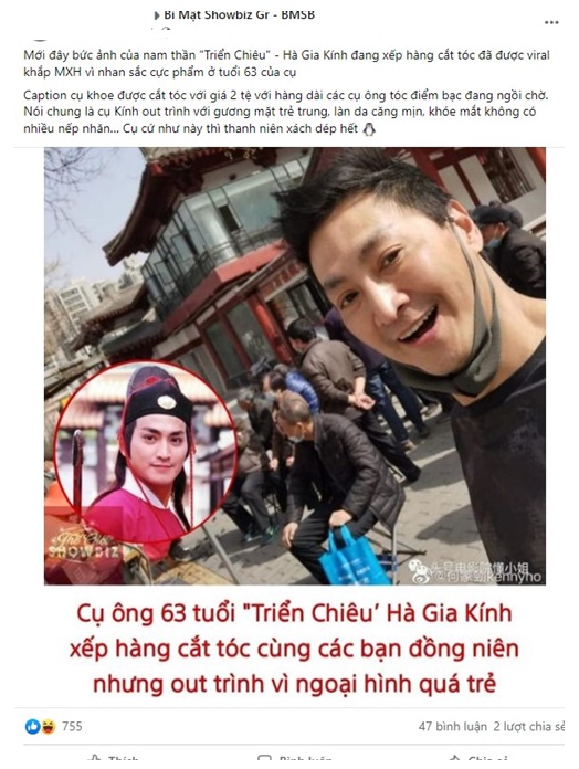 Trên trang cá nhân, Hà Gia Kính chia sẻ trạng thái được cắt tóc với giá 2 tệ với hàng dài các cụ ông tóc điểm bạc đang ngồi chờ. Bức ảnh cụ tự selfie với gương mặt trẻ trung, làn da căng mịn, khóe mắt không có nhiều nếp nhăn… khiến nhiều người không khỏi ngưỡng mộ. Nhiều lời nhận xét hài hước rằng “Cụ cứ như này thì thanh niên xách dép hết”