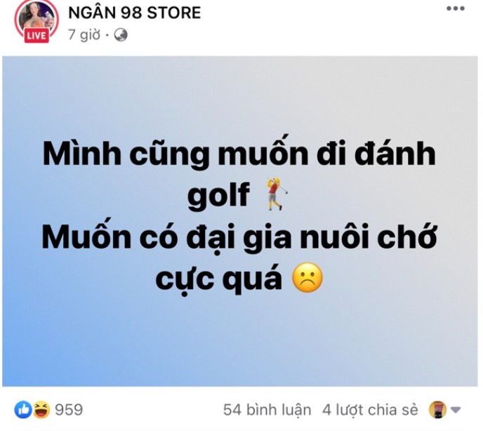 Mới đây, người đẹp Bình Định trên trang fanpage cá nhân chia sẻ dòng trạng thái: ‘Mình cũng muốn đi đánh golf, muốn có đại gia nuôi chứ cực quá!’. Động thái này của Ngân 98 bị nhiều người cho rằng gián tiếp "cà khịa" về scandal giật chồng đang gây bão những ngày vừa qua bởi khi sớm không khoe, muộn không khoe lại khoe đúng vào thời điểm nhạy cảm này.’