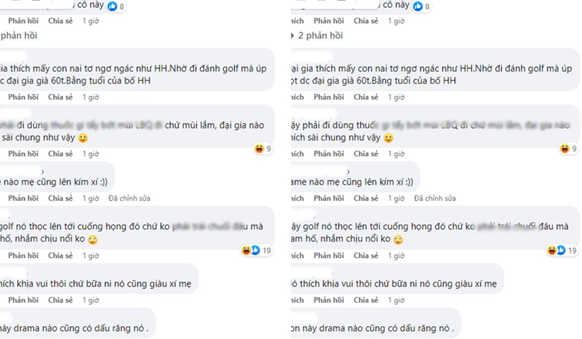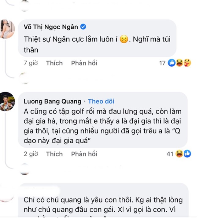 Đặc biệt, scandal càng được đẩy lên cao trào thì một tài khoản đã đăng hình nữ ca sĩ siêu thân thiết và tình tứ bên một đại gia U60 giấu mặt, cùng đi chơi golf với dòng caption: "Ét ô ét. Nghe đâu trend của các nàng xinh mà muốn giàu nhau thời ni là check-in sân golf. Cứ yêu 3-4 anh rồi xếp lịch thoai. Huhu, làm tui thích bà lắm luôn."