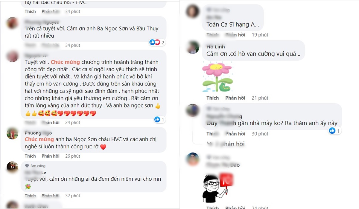 "Tuyệt vời . Chúc mừng chương trình hoành tráng thành công tốt đẹp nhất . Các ca sĩ ngôi sao yêu thích sẽ trình diễn tuyệt vời nhất . Và khán giả hạnh phúc vô bờ khi thấy em Hồ văn cường . Được đứng trên sân khấu cùng hát với những ca sĩ ngôi sao đình đám . hạnh phúc nhất cho những khán giả yêu thương em cường . Rất cảm ơn tấm lòng vàng của anh đức thụy . Và anh ba Ngọc Sơn."