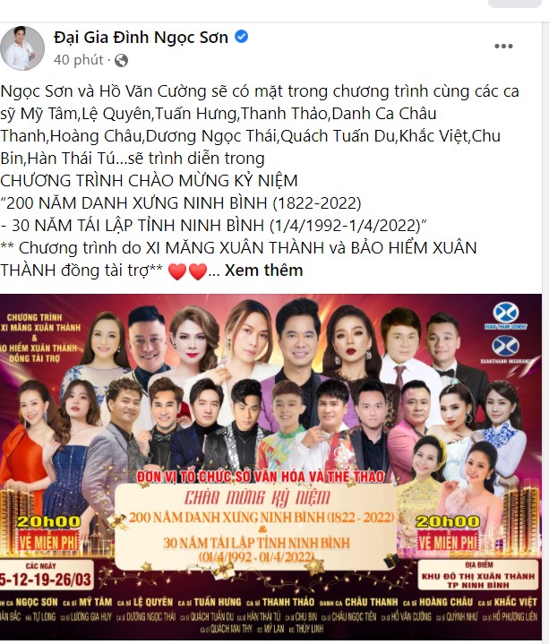 “Cảm ơn đại gia đình Nguyễn Đức Thụy đã tài trợ để người dân NB được nghe danh ca Ngọc Sơn, Hồ Văn Cường và các ca sĩ về hát.”
