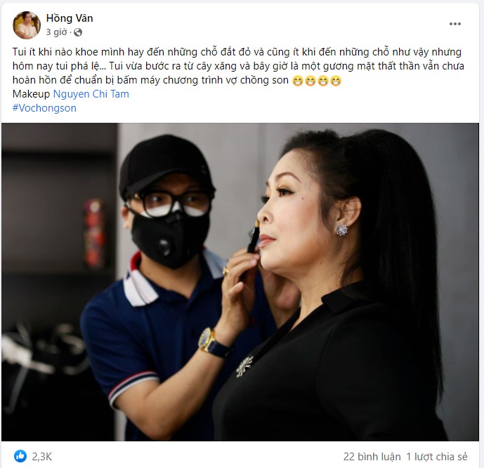 Thế nhưng, đầu tháng 3 vừa qua, nữ nghệ sĩ bất ngờ tiết lộ, sẽ sớm trở về Việt Nam vì con gái út phải đi học lại. Đúng như thông báo, mới đây, trên trang Facebook cá nhân, nghệ sĩ Hồng Vân chia sẻ hình ảnh đang make up trong hậu trường kèm dòng trạng thái như sau: "Tui ít khi nào khoe mình hay đến những chỗ đắt đỏ và cũng ít khi đến những chỗ như vậy nhưng hôm nay tui phá lệ... Tui vừa bước ra từ cây xăng và bây giờ là một gương mặt thất thần vẫn chưa hoàn hồn để chuẩn bị bấm máy chương trình Vợ chồng son."