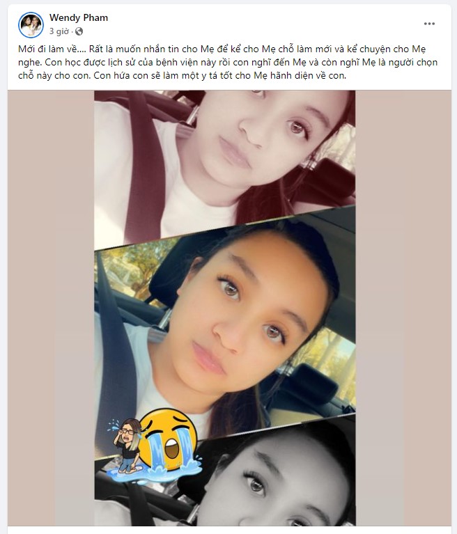 Mới đây, trên trang facebook cá nhân, Wendy Phạm thông báo đã đi làm tại nơi làm việc mới và chia sẻ kỉ niệm xúc động về mẹ, cô viết: "Mới đi làm về…. Rất là muốn nhắn tin cho Mẹ để kể cho Mẹ chỗ làm mới và kể chuyện cho Mẹ nghe. Con học được lịch sử của bệnh viện này rồi con nghĩ đến Mẹ và còn nghĩ Mẹ là người chọn chỗ này cho con. Con hứa con sẽ làm một y tá tốt cho Mẹ hãnh diện về con."