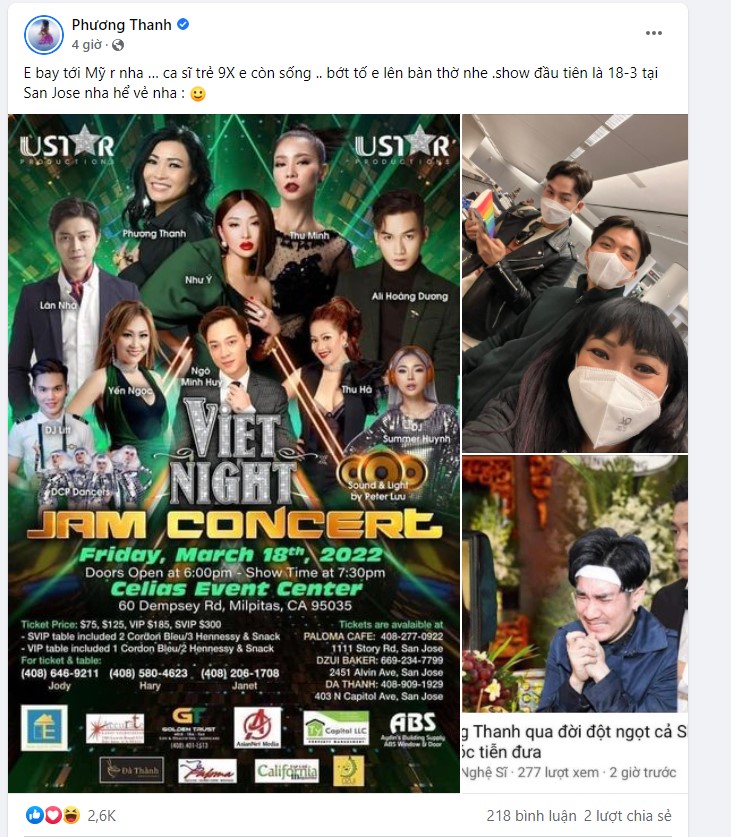 "Em bay tới Mỹ rồi nha … ca sĩ trẻ 9X e còn sống .. bớt tố em lên bàn thờ nhé .show đầu tiên là 18-3 tại San Jose nha hể vẻ nha"- Phương Thanh đính chính.