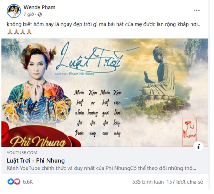 Mới đây, đúng dịp bà Nguyễn Phương Hằng bất ngờ gặp biến lớn, con gái ruột Phi Nhung là Wendy có dòng chia sẻ ẩn ý ngay trên trang cá nhân. Cụ thể, cô viết: ‘Không biết hôm nay là ngày đẹp trời gì mà bài hát của mẹ được lan rộng khắp nơi’ kèm theo đó là video về bài hát ‘Luật trời’ của người mẹ quá cố.