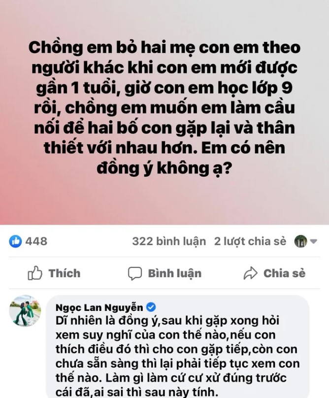 Mới đây, nữ diễn viên lại gây chú ý mạng xã hội khi nêu ra quan điểm cá nhân về câu hỏi có cho con gặp lại bố hay không sau khi ly dị dưới một bài đăng. Cụ thể, trên một diễn đàn lớn đã đưa ra vấn đề: “Chồng em bỏ hai mẹ con em theo người khác khi con em mới được gần 1 tuổi, giờ con em học lớp 9 rồi, chồng em muốn em làm cầu nối để hai bố con gặp lại và thân thiết với nhau hơn. Em có nên đồng ý không ạ?".