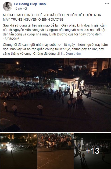 Theo đó, bà Thảo khẳng định, phía Trung Nguyên đã thuê 200 xã hội đen “đánh úp” và cướp trắng nhà máy ở Bình Dương trong đêm đồng thời lấy những dàn máy móc, nguyên vật liệu, tài liệu quan trọng. Đáng nói là bà Thảo cũng đồng thời đưa ra những bức ảnh về khung cảnh cướp nhà máy đêm 13/05/2016 kèm theo đó là nghi vấn về thế lực đứng sau “nhóm thao túng” Trung Nguyên. Bà Thảo cũng khẳng định sẽ đấu tranh đến cùng để bảo vệ tâm huyết, bảo vệ công ty cho các con của mình và mong mọi người nhìn nhận vấn đề đúng đắn.