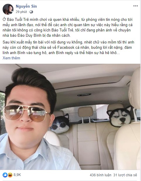 Theo đó, tài khoản FB này cho hay mình quen biết với lãnh đạo của Báo Tuổi Trẻ và không có ý định công kích tờ báo này và chỉ phán ảnh về sự “đa nhân cách” của nhà báo Đào Duy Bình bị đa nhân cách và tiết lộ rằng chính nhà báo này đã nhắn tin xin lỗi và hứa sẽ gỡ bài nhưng sau đó lại có sự xuất hiện của văn bản tố cáo. Nguyễn Sin cũng phân tích sự khẳng định vội vàng và gán ghép về việc anh khẳng định có người chết vì covid-19. Ngoài ra, Nguyễn Sin còn tuyên bố sẽ vạch trần những sự thật liên quan đền vị nhà báo này sau khi kết thúc sau vụ bé lavie.