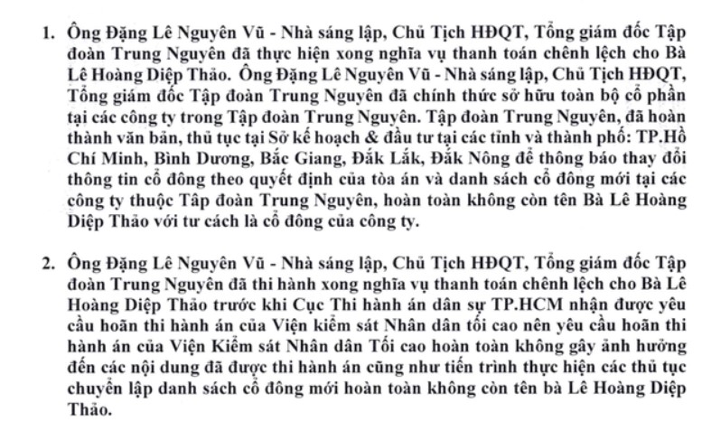Theo đó, báo Tuổi Trẻ đã đưa tin về việc thông cáo báo chí của tập Đoàn Trung Nguyên khẳng định bà Lê Hoàng Diệp Thảo không còn là vợ của ông Vũ đồng thời không còn là cổ đông của Trung Nguyên cũng không phải là người đồng sáng lập Trung Nguyên. Trong thông cáo báo chí, Trung Nguyên cho rằng bà Thảo luôn mạo danh, vu khống, bịa đặt sai sự thật làm ảnh hưởng đến uy tín, danh dự cá nhân ông Vũ, ảnh hưởng đến uy tín thương hiệu Tập đoàn Trung Nguyên. Tập đoàn Trung Nguyên khẳng định ông Vũ đã thi hành án và đã hoàn thành văn bản và đã hoàn thành văn bản, thủ tục thông báo thay đổi thông tin cổ đông theo quyết định của tòa án tại Sở Kế hoạch - đầu tư các tỉnh thành. Danh sách cổ đông mới tại các công ty thuộc Tập đoàn Trung Nguyên hoàn toàn không còn tên bà Thảo.