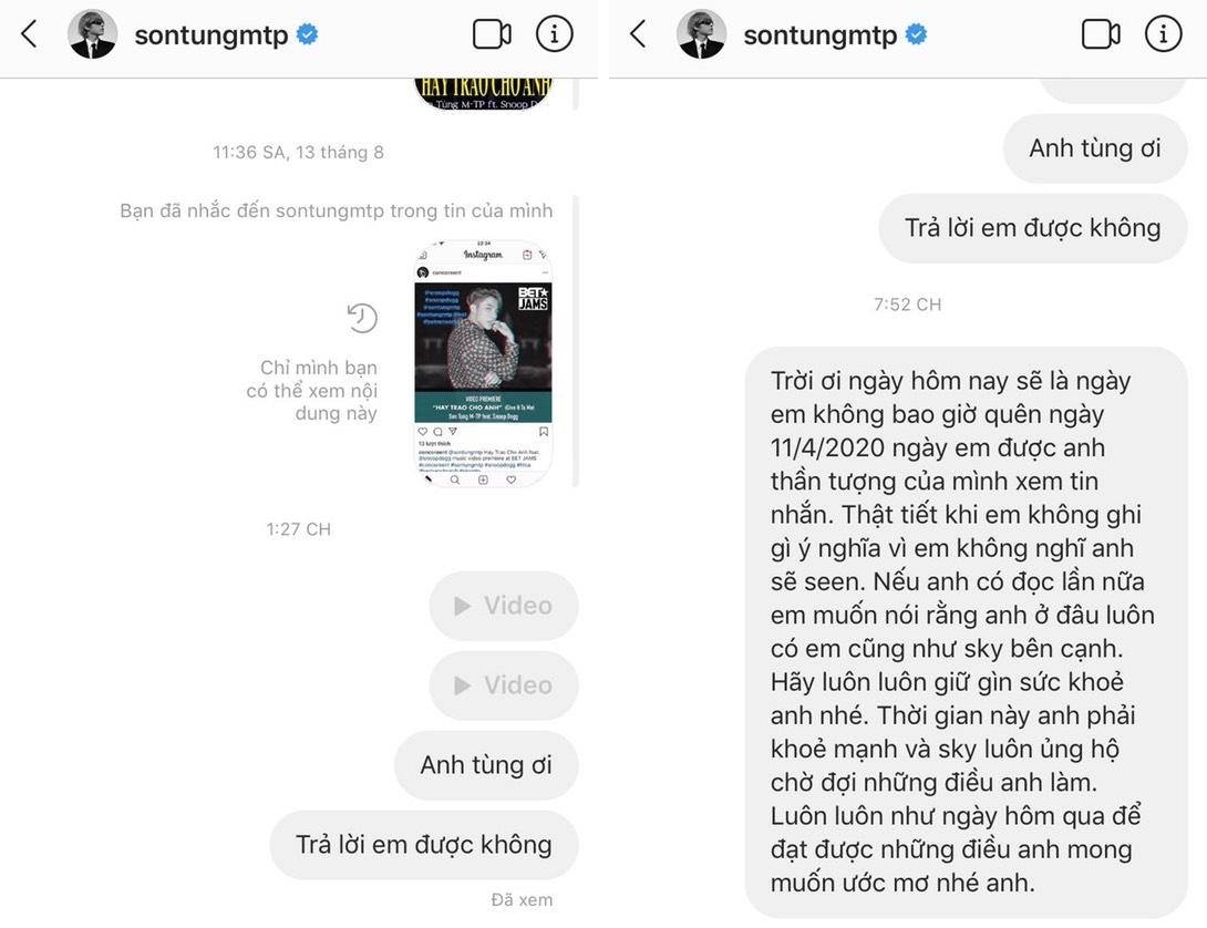 Cụ thể, đoạn tin nhắn có nội dung: 'Trời ơi ngày hôm nay sẽ là ngày em không bao giờ quên - ngày em được thần tượng của mình xem tin nhắn. Thật tiếc khi em không ghi gì ý nghĩa vì em không nghĩ anh sẽ seen. Nếu anh có đọc lần nữa, em muốn nói rằng anh ở đâu luôn có em cũng như Sky bên cạnh. Hãy luôn giữ gìn sức khỏe anh nhé. Thời gian này anh phải khỏe mạnh và Sky luôn ủng hộ, chờ đợi những điều anh làm.'