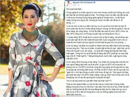 “Nếu không chỉ đích danh ai thì tôi cũng như khán giả, không thể biết chắc chắn là ca sĩ nào. Nhưng theo tôi thấy việc chị Kỳ Duyên kể lể ra những chuyện này thì có hơi “kỳ”. Bởi là người trong nghề lâu năm, tôi chứng kiến đâu thiếu gì những chuyện hậu trường còn ghê gớm hơn, muốn kể ra thì có cả tỉ chuyện để bàn nhưng tôi không làm vậy. Tính tôi không hơi đâu ngồi nói me móc, hay viết lên trang cá nhân để nói xấu người khác. Nếu lời nói của chị mang tính góp ý đến đàn em thì nên gọi điện thẳng cho cô ca sĩ đó để nói chuyện. Tất cả đều là người lớn, nên đề cao tính con người, nhân văn lên trên hết.