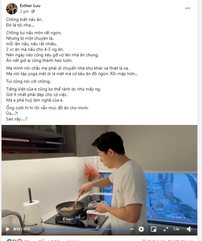 “Chồng biết nấu ăn.Đó là tội nha....Chồng tui nấu món rất ngon. Nhưng bị một chuyện là..