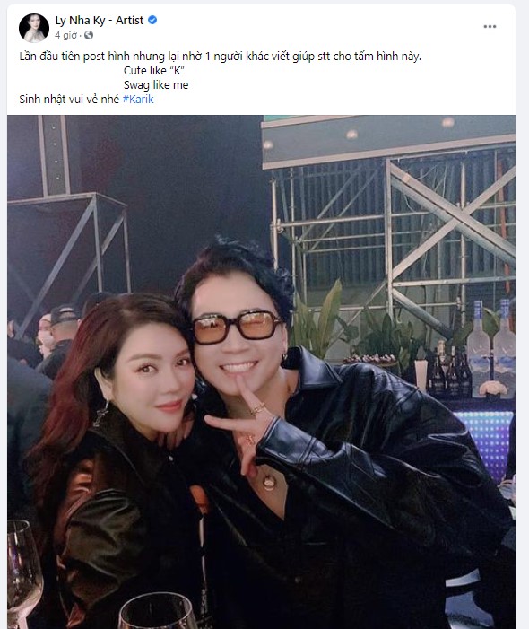 Mới đây, trên trang cá nhân, Lý Nhã Kỳ đã đăng hình ảnh chụp cùng nam rapper Karik và gửi lời sinh nhật tuổi 32 của anh. Được biết, bức ảnh này được chụp trong concert Rap Việt vừa được tổ chức cách đây vài ngày. Trong khi Karik vô cùng dễ thương thì Lý Nhã Kỳ Lại vô cùng cá tính trong bộ váy da màu đên.