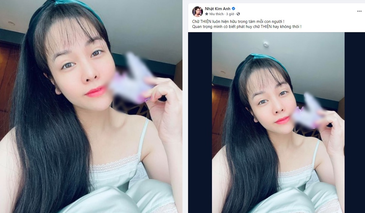 Đăng tải hình ảnh đầy dễ thương nhưng Nhật Kim Anh lại đi kèm với dòng trạng thái đầy tâm trạng: “Chữ THIỆN luôn hiện hữu trong tâm mỗi con người ! Quan trọng mình có biết phát huy chữ THIỆN hay không thôi !”