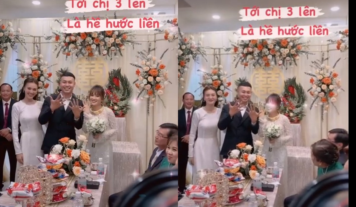 Trong clip tiếp theo, Ninh Dương Lan Ngọc lên chụp hình với cặp cô dâu chú rể trong đám hỏi còn chủ thích thêm: “Tới chị ba lên là hài hước liền”. Hóa ra đây là hỉ sự của em trai út nhà Ninh Dương Lan Ngọc. Có thể thấy nữ diễn viên vô cùng vui vẻ trong ngày vui của em trai, đáng nói cô còn hài hước gợi ý em trai dơ bàn tay lên khoe ‘vàng cưới’ để chụp ảnh. Thậm chí, cô nàng còn khoe vẻ mặt của bố khi cuối cùng cũng có con dâu.
