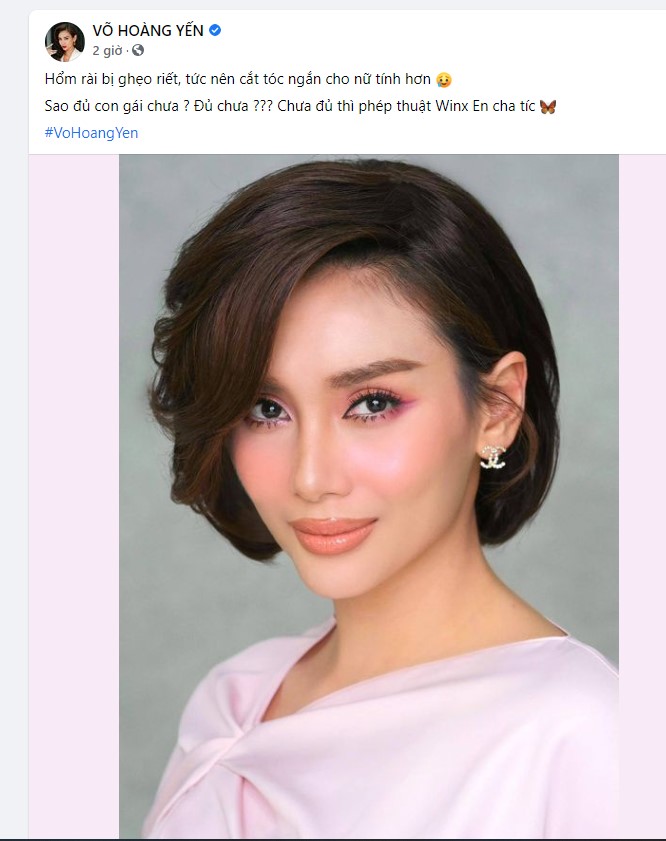 Hình ảnh chụp cận mặt của Võ Hoàng Yên với phong cách nữ tính nhanh chóng nhận về sự chú ý của khán giả. Nữ người mẫu còn trêu đùa về sự thử nghiệm phong cách lạ lẫm này như sau: “Hổm rày bị ghẹo riết, tức nên cắt tóc ngắn cho nữ tính hơn. Sao đủ con gái chưa? Đủ chưa? Chưa đủ thì phép thuật Winx En cha tíc”.