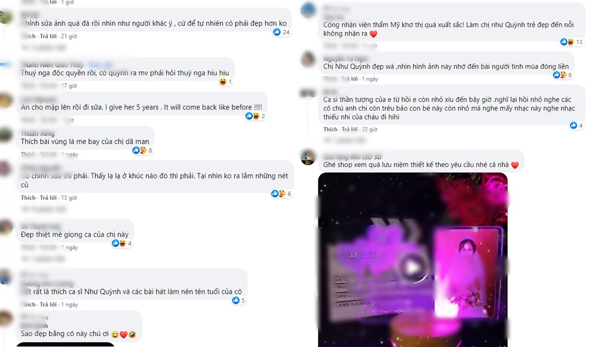 Thậm chí ở dưới phần bình luận của bài đăng của Trấn Thành, có người còn cho rằng Như Quỳnh can thiệp "dao kéo" để cải thiện nhan sắc: “Có chỉnh sửa thì phải. Thấy lạ lạ ở khúc nào đó thì phải. Tại nhìn ko ra lắm những nét cũ”, “Công nhận viện thẩm Mỹ quá xuất sắc! Làm chị như Quỳnh trẻ đẹp đến nỗi không nhận ra”.