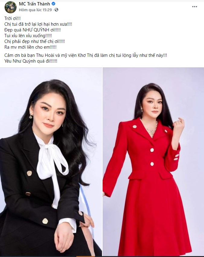 Thậm chí MC Trấn Thành còn đăng hình ảnh đầy xinh đẹp của NS Như Quỳnh trên trang cá nhân, nhận được sự quan tâm đặc biệt từ khán giả.