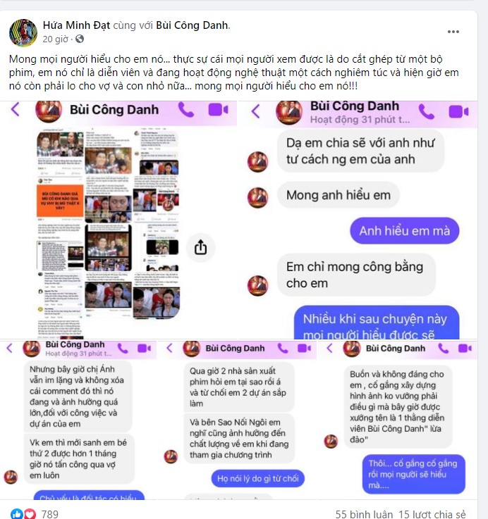 Thông qua bài đăng, có thể thấy Bùi Công Danh hiện đang rất khổ sở vì những hiểu lầm về đoạn clip. Anh thậm chí còn bị 2 nhà sản xuất phim từ chối vì sợ ảnh hưởng đến danh tiếng, phải cầu cứu Hứa Minh Đạt.