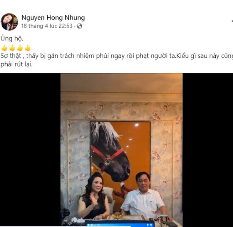 Có thể thầy, vợ nghệ sĩ Xuân Bắc rất đồng ý với màn cảnh cáo của bà Hằng thậm chí còn vô cùng ấm ức vì những hiềm khích với cựu mẫu vào 3 năm trước. Thêm vào đó, trên trang cá nhân của mình, chị Nguyễn Hồng Nhung còn thể hiện sự ủng hộ với hành động của bà Nguyễn Phương Hằng khi vạch trần sự thật bộ mặt thật của Võ Hoàng Yên.