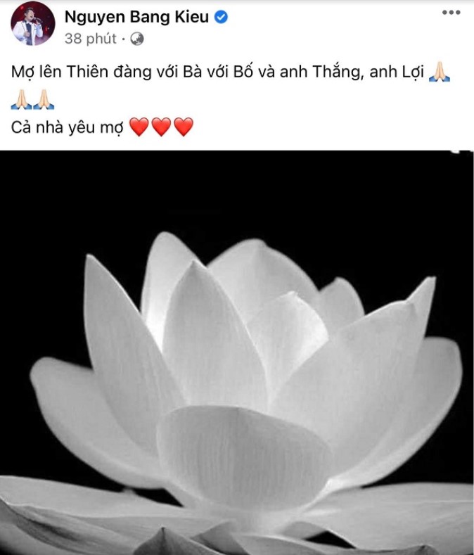 Vừa ngày hôm qua 1/4, chồng cũ của Trizzie Phương Trinh bất ngờ đăng tải dòng trạng thái thông báo người thân qua đời. Anh viết: "Mợ lên Thiên đàng với Bà với Bố và anh Thắng, anh Lợi. Cả nhà yêu mợ". Sau sự ra đi của bà, bố và hai anh thì Bằng Kiều tiếp tục nhận thêm tin dữ từ mợ của mình. Chỉ trong vòng một thời gian ngắn, tang sự nối tiếp nhau chắc hẳn nam ca sĩ không tránh khỏi nỗi đau đớn, tiếc thương cho người thân.