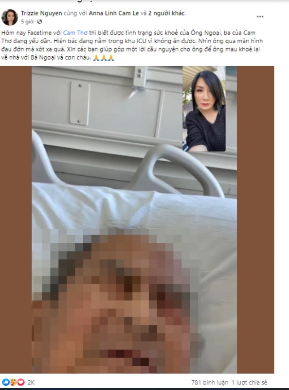 Được biết, tại Mỹ ca sĩ Cam Thơ là một trong những người bạn thân nhất của Trizzie Phương Trinh. Cặp đôi đã song hành cùng nhau trong rất nhiều sự kiện, show diễn. Cả hai còn thường xuyên thực hiện nhiều video cùng nhau trên mạng xã hội youtube, gắn bó như keo sơn. Do vậy, Trizzie Phương Trinh coi gia đình Cam Thơ như gia đình của mình. Là con, cháu trong nhà khi hay tin bố của Cam Tho đang đối mặt với tình trạng nguy hiểm, ngay lập tức, Trizzie Phương Trinh hy vọng khán giả giúp góp một lời cầu nguyện cho ông để ông mau khoẻ lại.