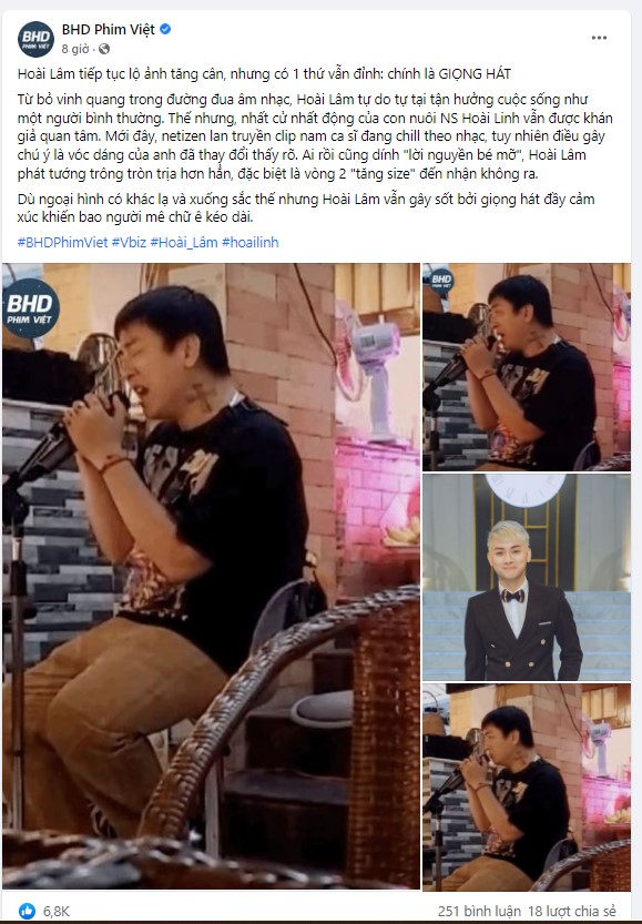 Mới đây trang fanpage BHD Phim Việt đã đăng tải những bức hình của Hoài Lâm đang đắm chìm theo nhạc với tiêu đề: “Hoài Lâm tiếp tục lộ ảnh tăng cân, nhưng có 1 thứ vẫn đỉnh: chính là GIỌNG HÁT”.