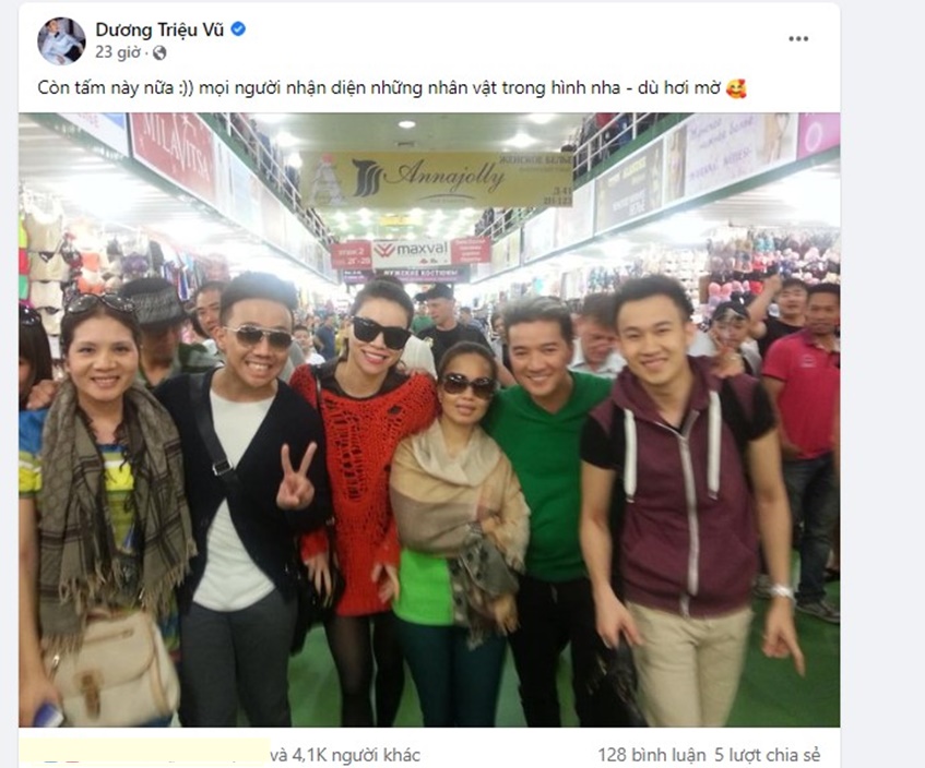 Gần đây nhất là bức ảnh Dương Triệu Vũ chụp cùng với Trấn Thành, Hồ Ngọc Hà, Cẩm Ly và Đàm Vĩnh Hưng. Có thể thấy, dù đã nhiều thập kỉ trôi qua nhưng Dương Triệu Vũ vẫn giữ được nét trẻ trung ngày nào, không hổ danh với danh xưng “lão hóa ngược”. Bên cạnh đó, những nhân vật đình đám còn lại cũng nhận được những lời khen xuýt xoa của cư dân mạng với ngoại hình trẻ trung không kém cạnh nhân vật chính.