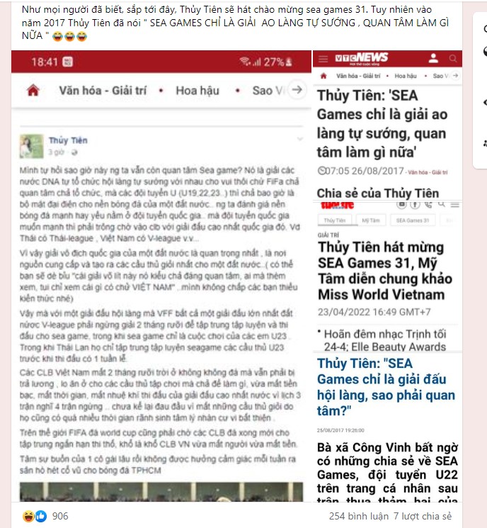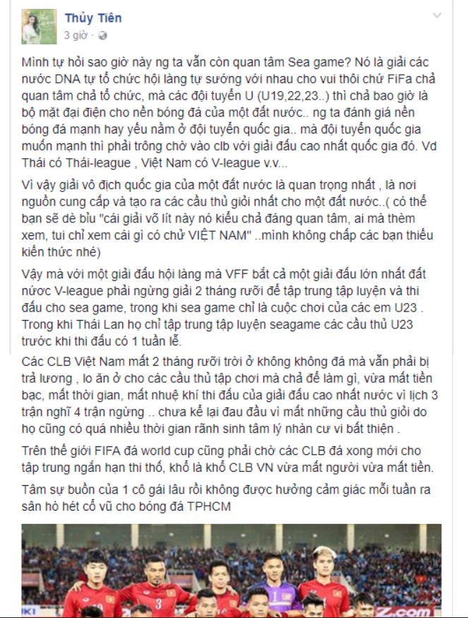 Theo đó, trên nhiều diễn đàn đã đăng lại dòng trạng thái của nữ ca sĩ vào năm 2017 khi chê SEA Games là giải "ao làng". Thậm chí, bà xã Công Vinh còn dùng những từ ngữ nặng nề để dè bỉu thế vận hội Đông Nam Á.
