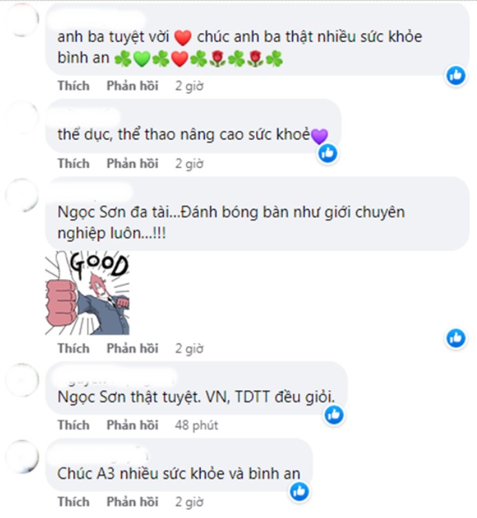 "Ba tuyệt vời ba hát hay sáng tác cũng hay giờ ba đánh bóng cũng tuyệt quá Ba Sơn đa tài quá ạ!"