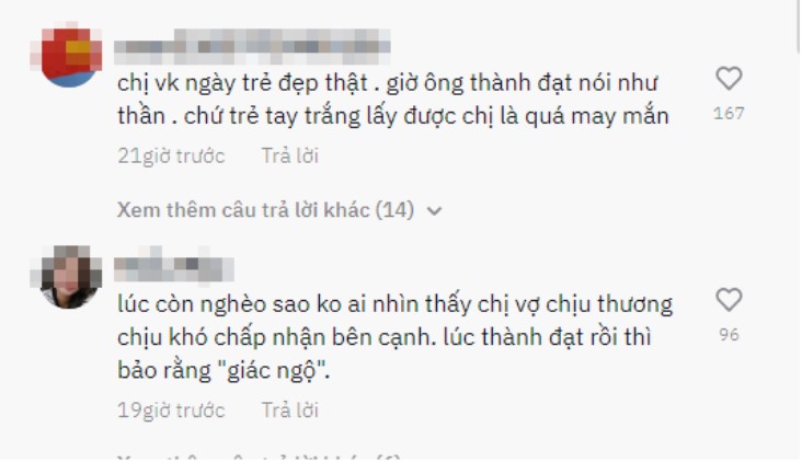 “Lúc còn nghèo sao ko ai nhìn thấy chị vợ chịu thương chịu khó chấp nhận bên cạnh. lúc thành đạt rồi thì bảo rằng "giác ngộ"”.