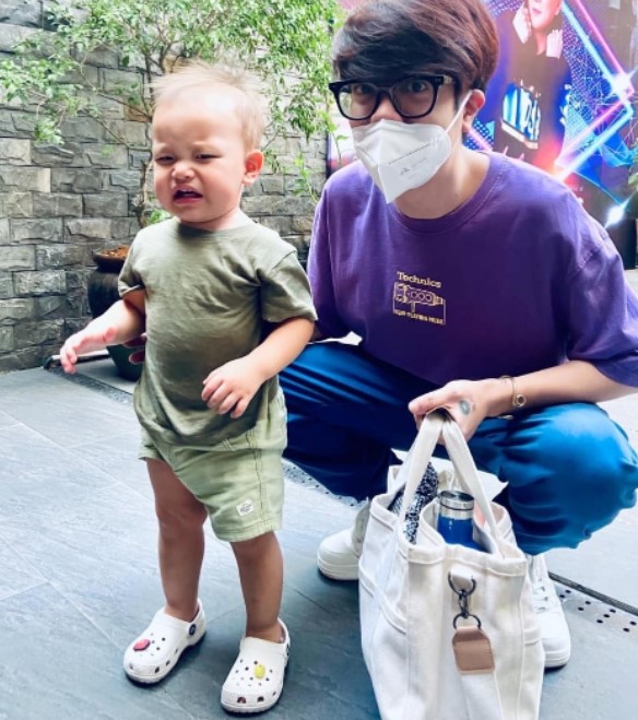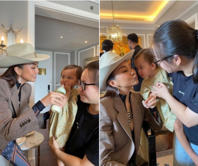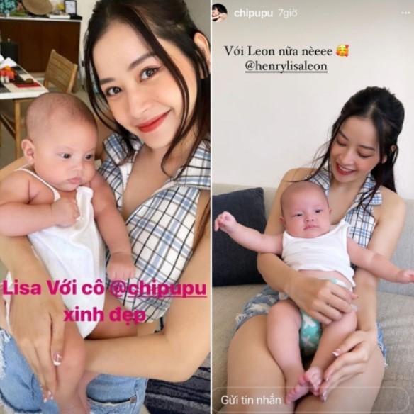 Hay như siêu mẫu Lê Thúy cũng là một fan chính hiệu của hai nhóc tỳ này. Trong một lần đi du lịch cùng hai bé, Lê Thúy đã thoải mái bồng bế và tạo dáng chụp hình nhí nhảnh bên hồ bơi cùng Lisa và Leon, tạo nên những khoảnh khắc dễ thương và thú vị.