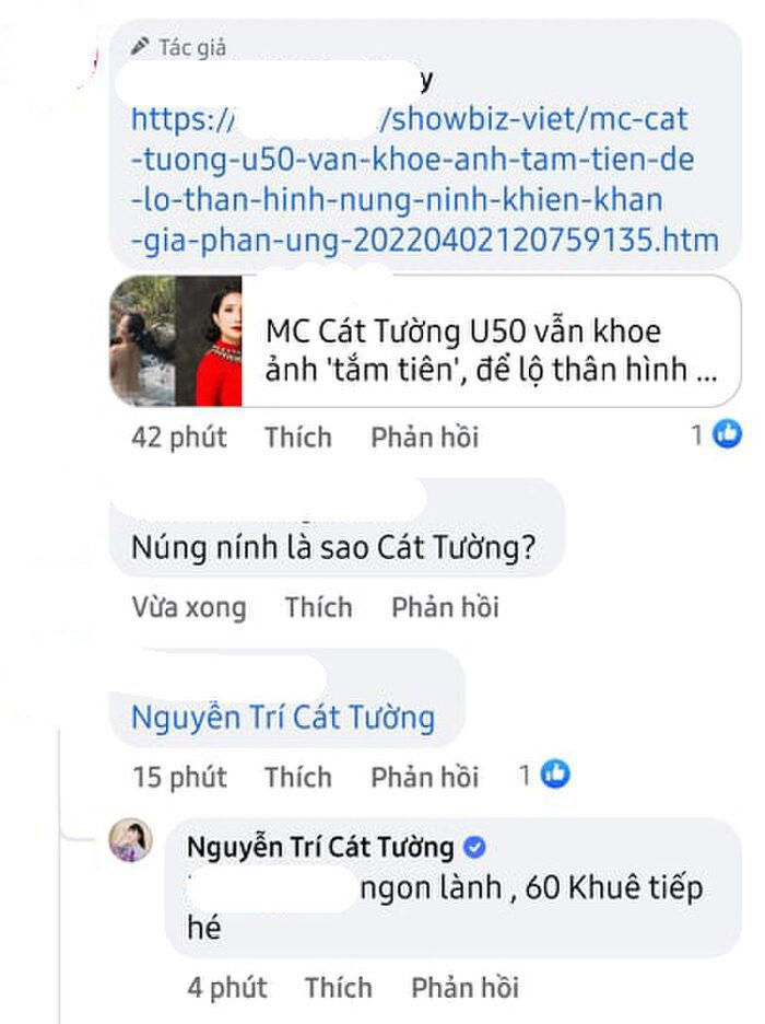 Tuy nhiên, đáng chú ý khi có một comment của một người bạn tag hẳn tên Cát Tường dưới phần bình luận của bài đăng. Ngay sau đó, nữ MC nhanh chóng trả lời bình luận. Có thể thấy những phản ứng của cư dân mạng không quá làm ảnh hưởng tới Cát Tường khi cô viết:"Ngon lành, 60 khoe tiếp nhé".