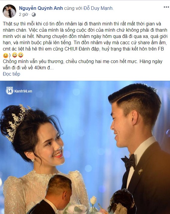 Trước tin đồn thất thiệt liên quan đến việc cầu thủ Duy Mạnh đánh vợ là hot girl Quỳnh Anh được lan truyền vào tối ngày 11/5, bà xã Duy Manh đã ngay lập tức đang một tâm thư lên trang cá nhân vào sáng ngày 12/5 để giải thích. Theo đó, Quỳnh Anh cho hay hoàn toàn không việc chồng mình đánh đập hay hủy trạng thái đã kết hôn trên Facebook. Thậm chí cô còn khẳng định Duy Mạnh là người chồng yêu chiều vợ con, lặn lội 40km để về với vợ con mỗi ngày hay bắt vợ ăn từ cốc sữa đến bát yến.