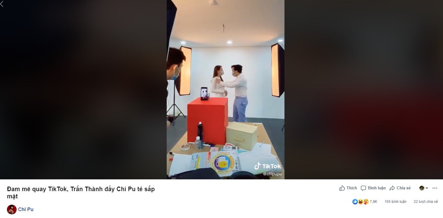 Như thường lệ, Chi Pu đã đăng clip hậu trường của màn kết hợp này vào tối 5/11 với tiêu đề “Đam mê quay TikTok, Trấn Thành đẩy Chi Pu té sấp mặt” với dòng mô tả “Hậu trường tàn khốc của chiếc clip TikTok hôm qua…”. Trong clip này, người đẹp đã chia sẻ cảnh Trấn Thành vì quá nhập tâm như thường lệ mà đã “xô ngã” mình xuống sàn, thậm chí còn “lộ hàng”.
