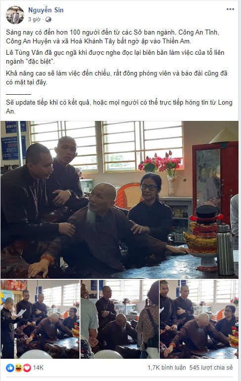 Kèm theo bức ảnh của “vị sư trụ trì” của Tịnh thất Bồng Lai làm việc với cơ quan chức năng, Nguyễn Sin cung cấp thông tin như sau: “Sáng nay có đến hơn 100 người đến từ các Sở ban ngành, Công An Tỉnh, Công An Huyện và xã Hoà Khánh Tây bất ngờ ập vào Thiền Am. Lê Tùng Vân đã gục ngã khi được nghe đọc lại biên bản làm việc của tổ liên ngành "đặc biệt".