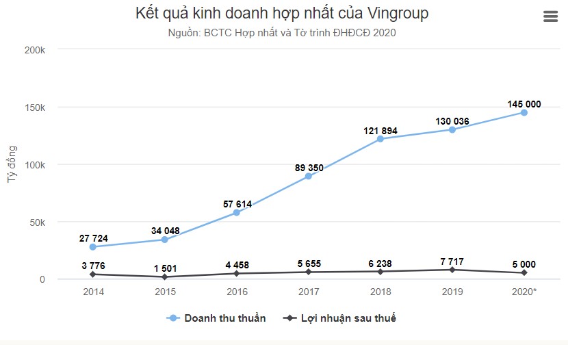 Mục tiêu được Vingroup trong năm 2020 đặt ra bao gồm: khoảng 145.000 tỷ đồng doanh thu thuần tăng gần 12% so với năm 2019, lợi nhuận sau thuế khoảng 5.000 tỷ đồng, giảm 35%. Theo đó, Vingroup tăng mục tiêu doanh thu, giảm lợi nhuận dù đã đặt trọng tâm vào chi phí.