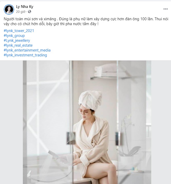 Mới đây nhất, ‘bà hoàng kim cương’ đã bất ngờ đăng tải hình ảnh chụp trong nhà tắm đầy quyến rũ cùng trạng thái tâm sự về việc phải tất bận với việc xây nhà mới: “Người toàn mùi sơn và xi măng . Đúng là phụ nữ làm xây dựng cực hơn đàn ông 100 lần. Thôi nói vậy cho có chút hờn dỗi, bây giờ thì pha nước tắm đây ! "