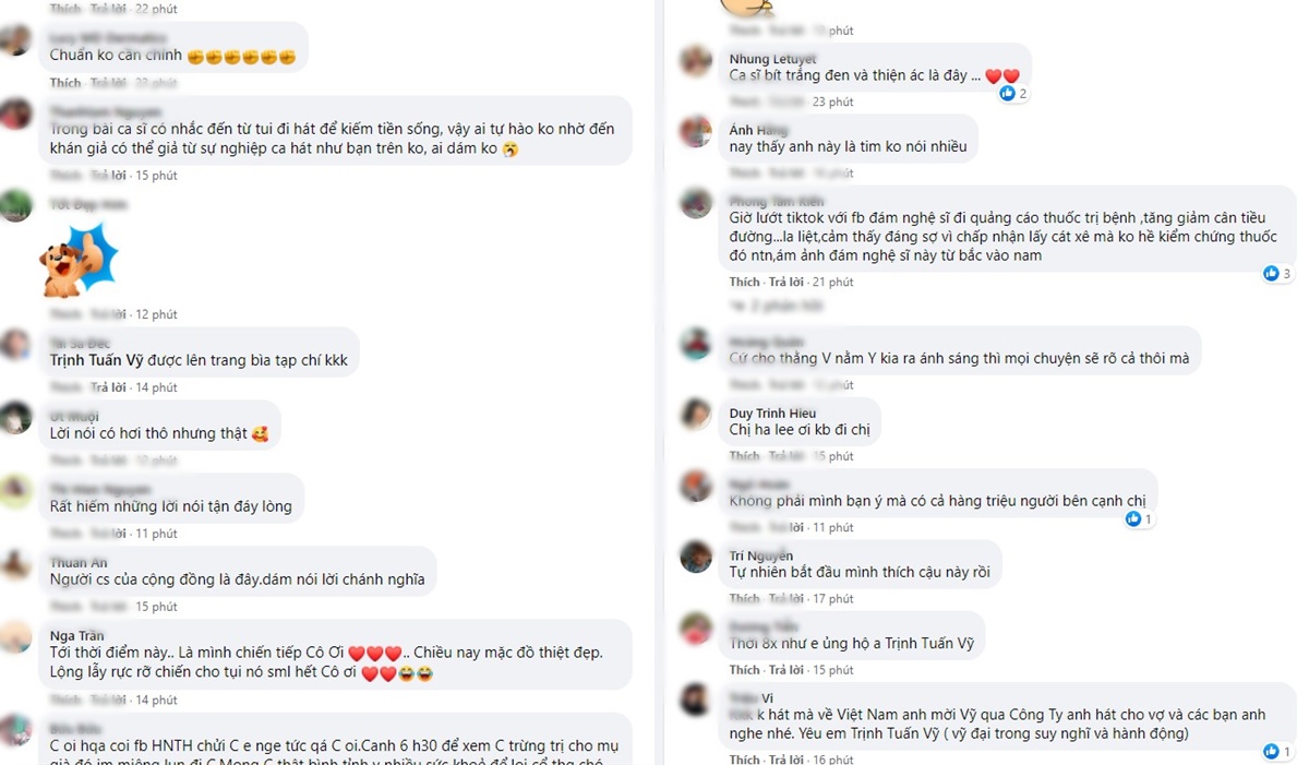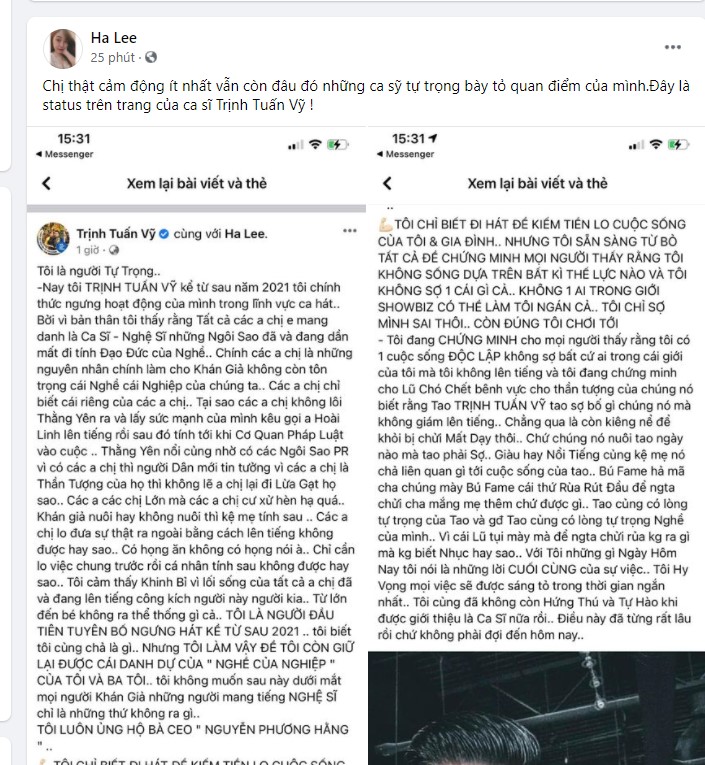 Tài khoản trợ lý đăng tải cảm xúc của bà Nguyễn Phương Hằng: “Chị thật cảm động ít nhất vẫn còn đâu đó những ca sỹ tự trọng bày tỏ quan điểm của mình.Đây là status trên trang của ca sĩ Trịnh Tuấn Vỹ !”