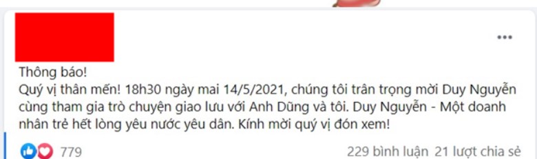Quý vị thân mến! 18h30 ngày mai 14/5/2021, chúng tôi trân trọng mời Duy Nguyễn cùng tham gia trò chuyện giao lưu với Anh Dũng và tôi. Duy Nguyễn - Một doanh nhân trẻ hết lòng yêu nước yêu dân. Kính mời quý vị đón xem!”