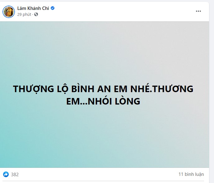 Mới đây, vào lúc giữa đêm ngày 30-4, nữ ca sĩ Lâm Khánh Chi bất ngờ đăng tải một dòng trạng thái đầy bàng hoàng trên trang cá nhân: “THƯỢNG LỘ BÌNH AN EM NHÉ.THƯƠNG EM...NHÓI LÒNG!”