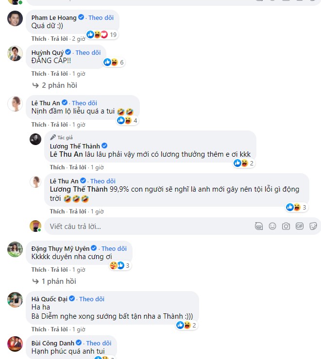 Nhiều nghệ sĩ, khán giả phải dành lời khen cho sự thông minh và hài hước của Lương Thế Thành: “Đẳng cấp”, “Bà Diễm nghe xong sướng bất tận nha anh Thành”, “Hạnh phúc quá anh tui”, “Tránh dịch xuất khẩu thành thơ hay quá!”, “Thơ này Thành sáng tác hả em Trai, hay thiệt lun!”