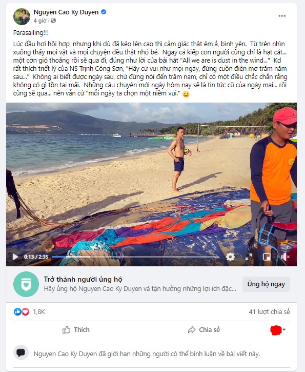 Giữa tâm bão chỉ trích, nữ MC hải ngoại Nguyễn Cao Kỳ Duyên không lên tiếng gì thêm về về lùm xùm liên quan đến bà Hằng. Mới đây nhất, vào sáng ngày 20/5, nữ MC vẫn đăng tải khoảnh khắc vui vẻ khi trải nghiệm nhảy dù trên bãi biển.