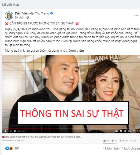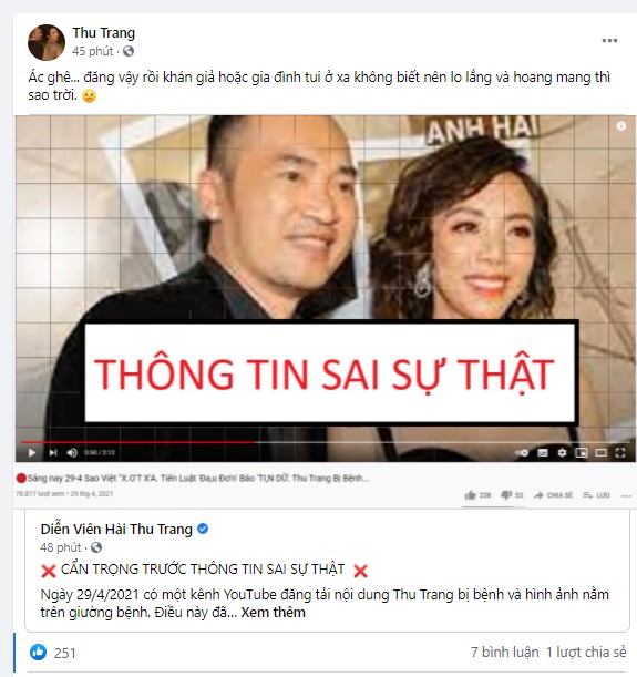 Theo đó, một kênh youtube đã thực hiện một video với tựa đề gây hoang mang: “Sáng ngay 29-4: Sao Việt xót xa, Tiến Luật đau đớn báo tin dữ, Thu Trang bị bệnh”