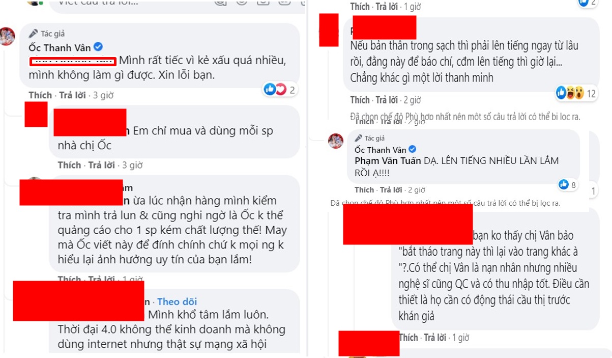 Trước ý kiến cho rằng Ốc Thanh Vân chỉ chờ lúc giới nghệ sĩ bị lên tiếng về vấn đề quảng cáo thì cô mới lên tiếng, nữ MC cho hay cô đã lên tiếng từ rất lâu và cảnh báo liên tục trên facebook của mình về các trang giả mạo.